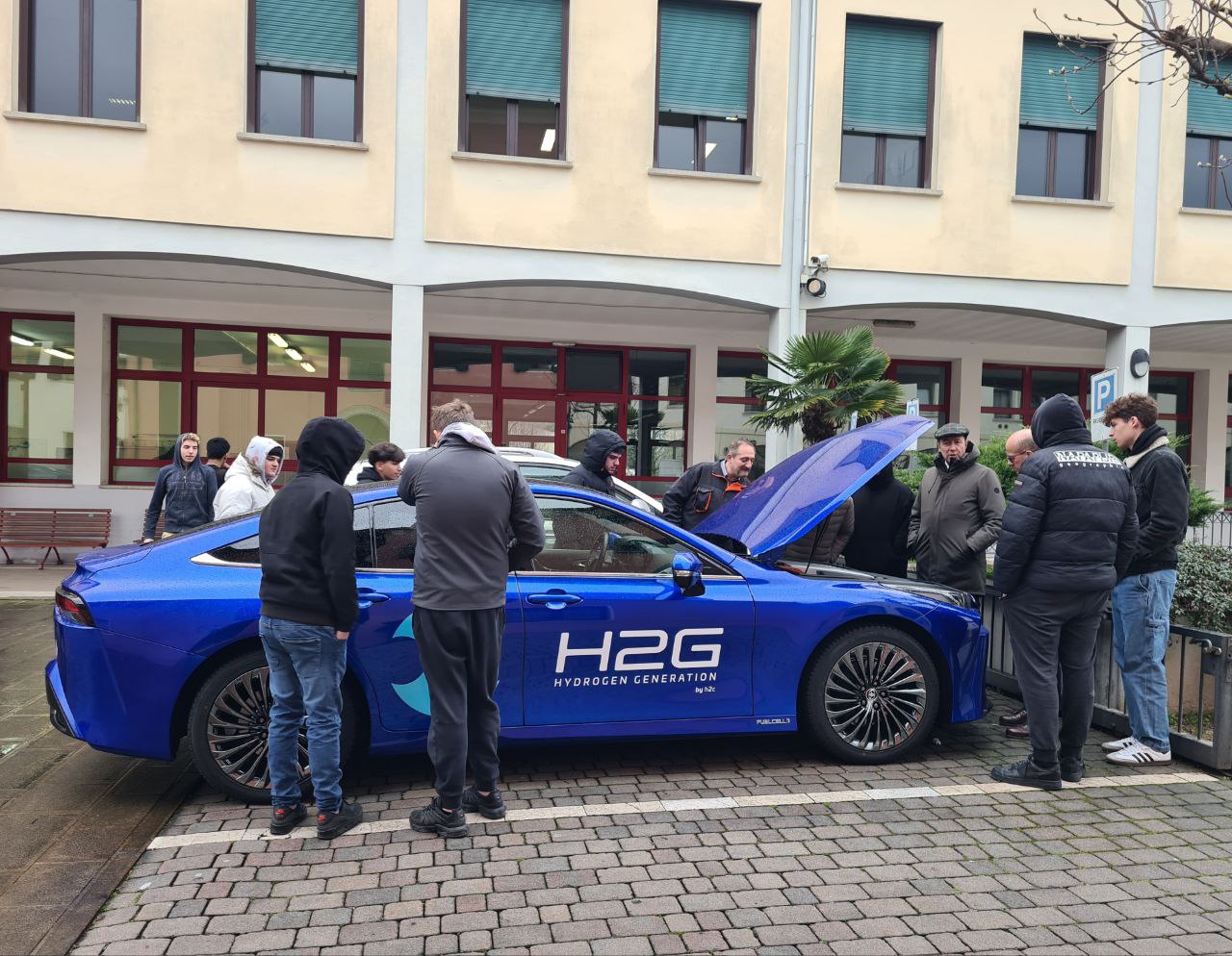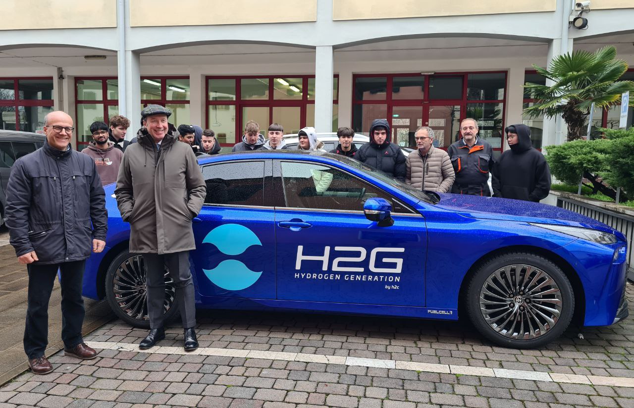 è arrivato a bordo della sua Toyota Mirai a idrogeno verde Guido Casellato, Ceo di H2C, società che si occupa di impianti per l’idrogeno verde, per incontrare la classe Terza - Auto della scuola di formazione professionale Camerini-Rossi di Fondazione IRPEA ETS.